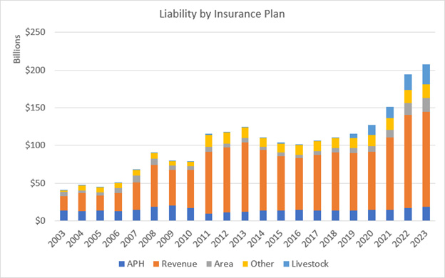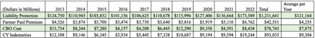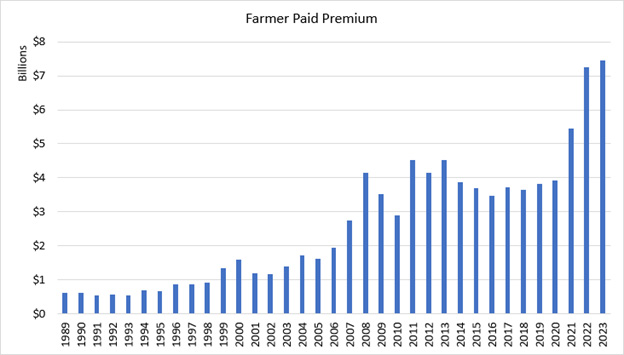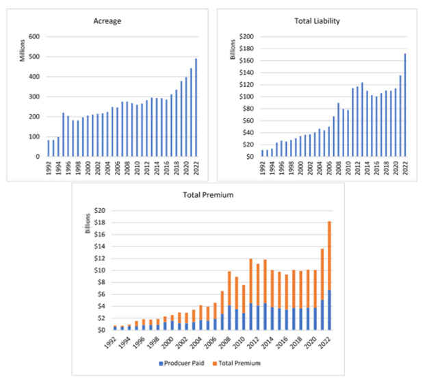 Federal Crop Insurance has grown from $2.5 billion in total premium paid covering 206 million acres and $34.4 billion in total liability to $18 billion in total premiums on 539 million acres with $180.8 billion in liability.
